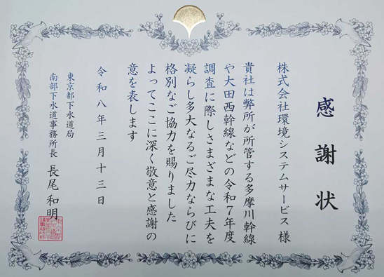 感謝状を拝受しました 2026年3月13日 最終更新日時 : 2026年3月30日 kssjapan 埼玉県八潮市で発生した道路陥没を受けて、「国の要請に基づく下水道管の緊急点検」が全国で実施されました。弊社は、東京都下水道局が管理する多摩川幹線、大田西幹線の調査に対応させていただきました。